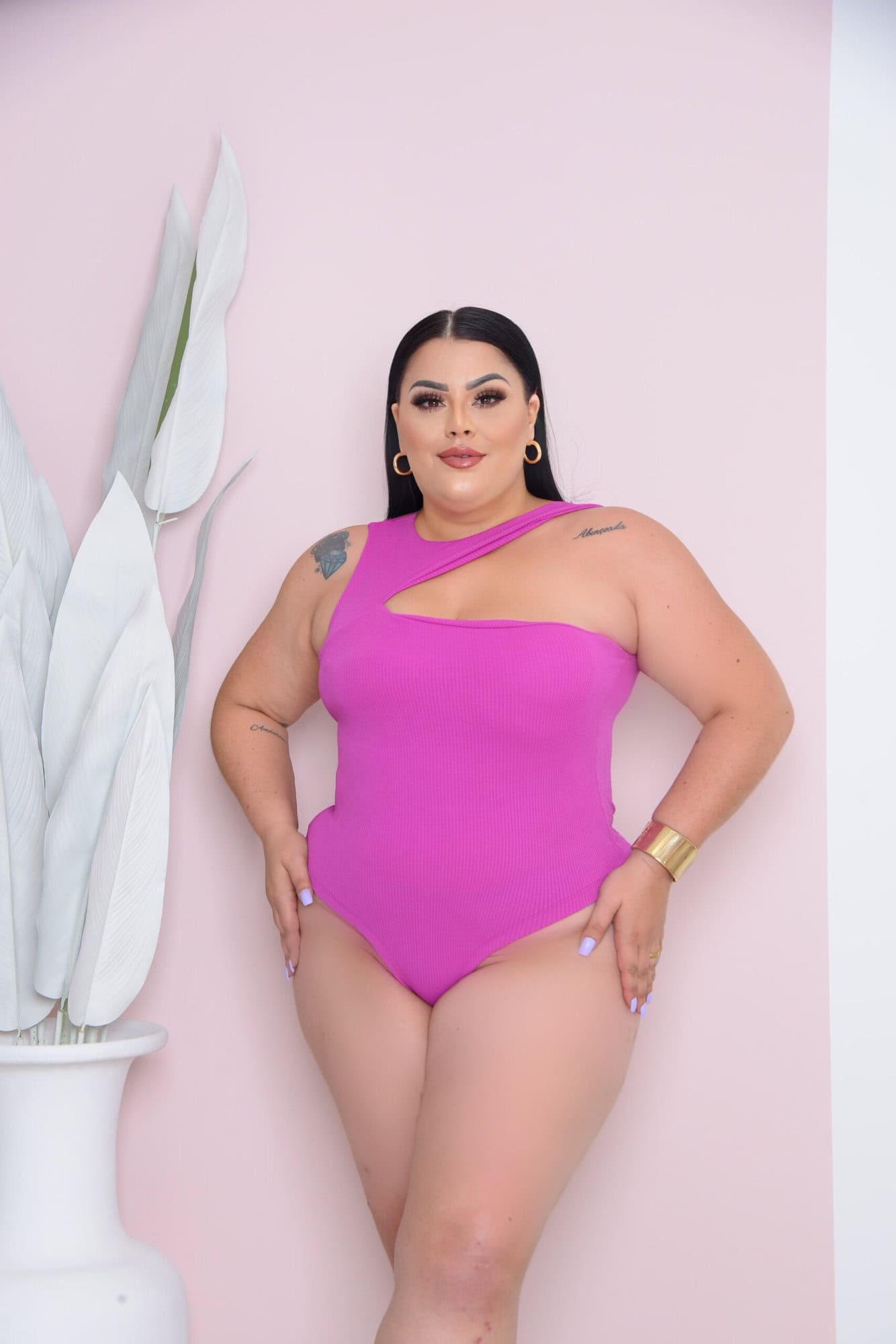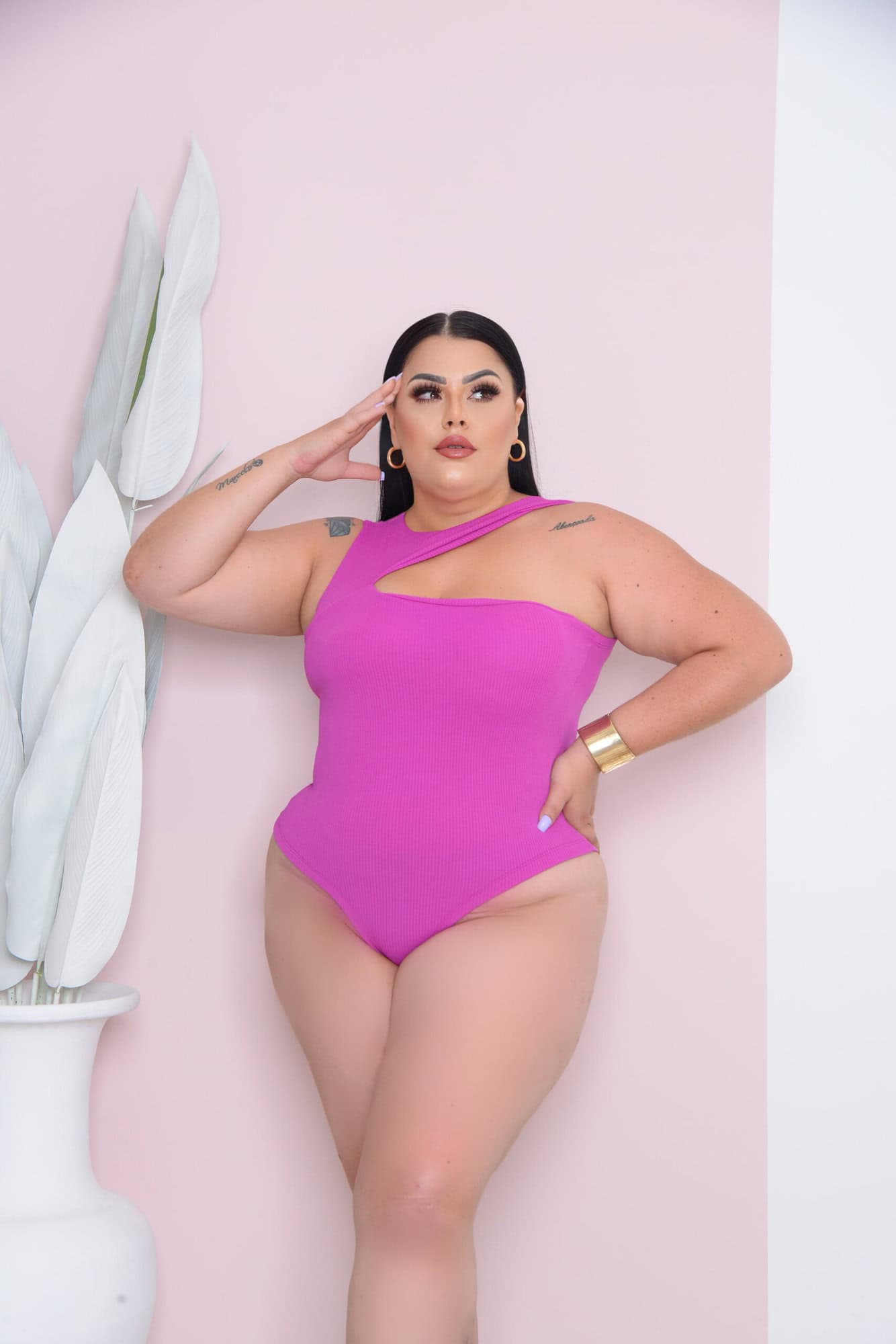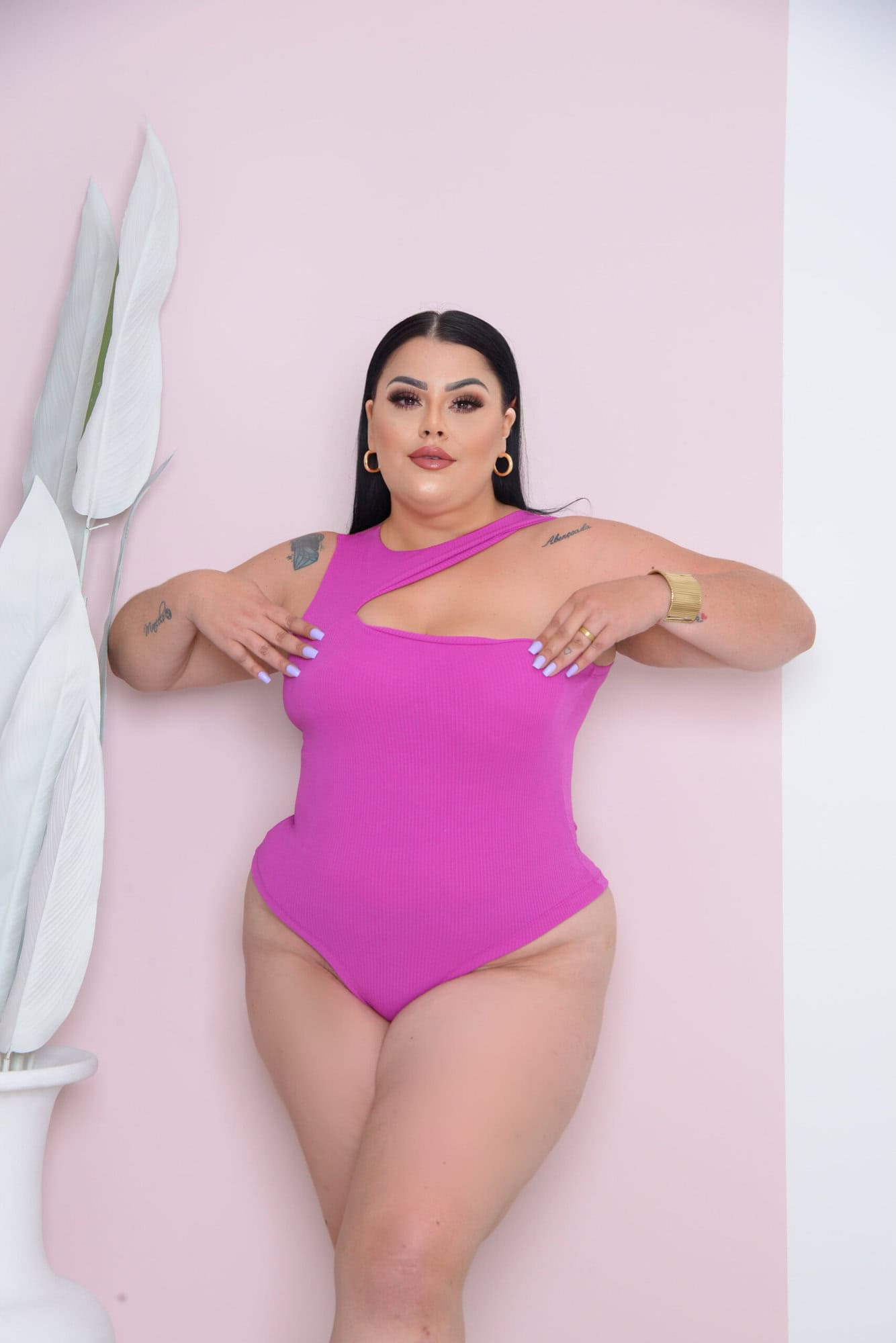 Body anarruga Mada com decote transversal Plus Size Fucsia