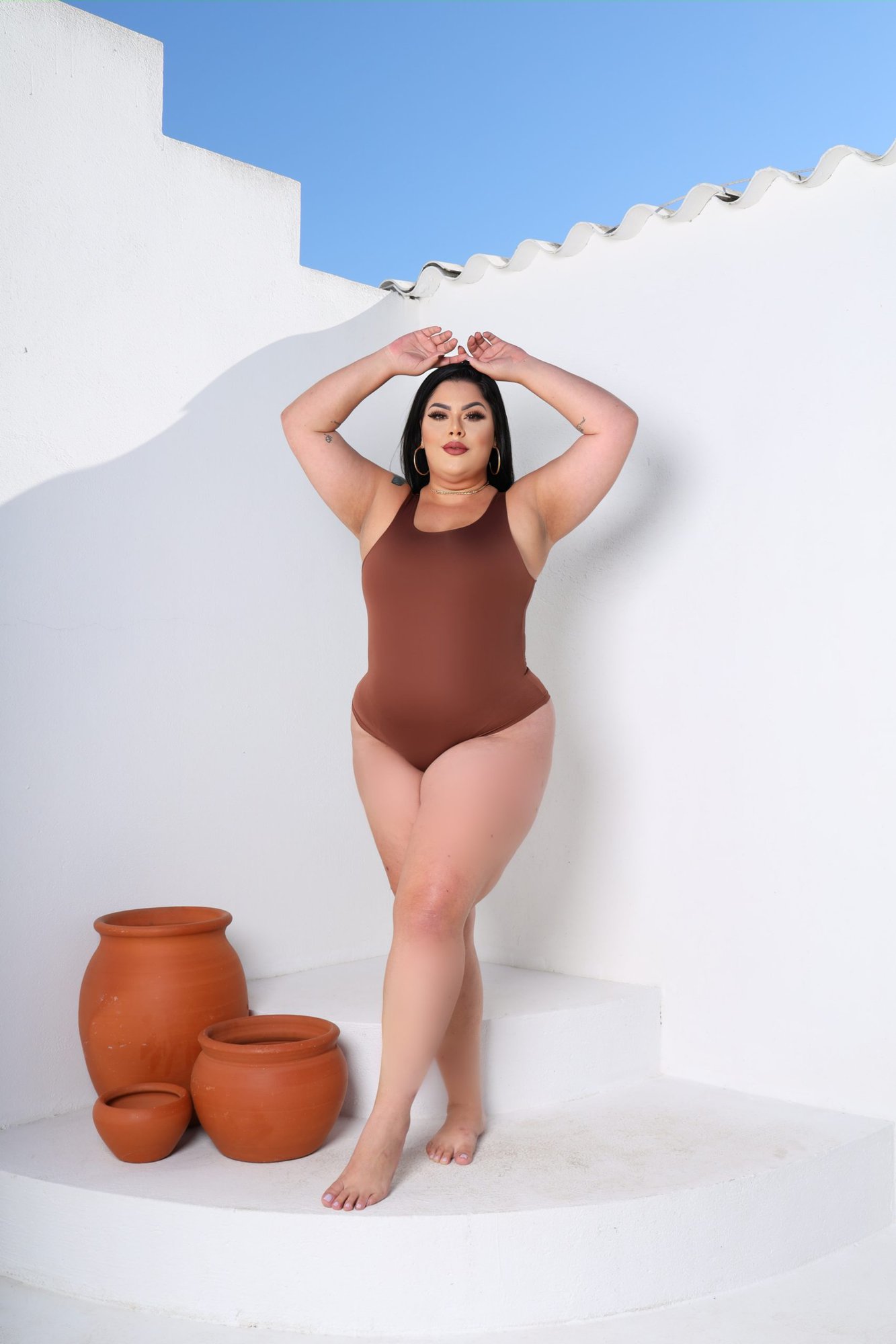 Body Zarah fluity Gola Redonda Marrom Plus Size