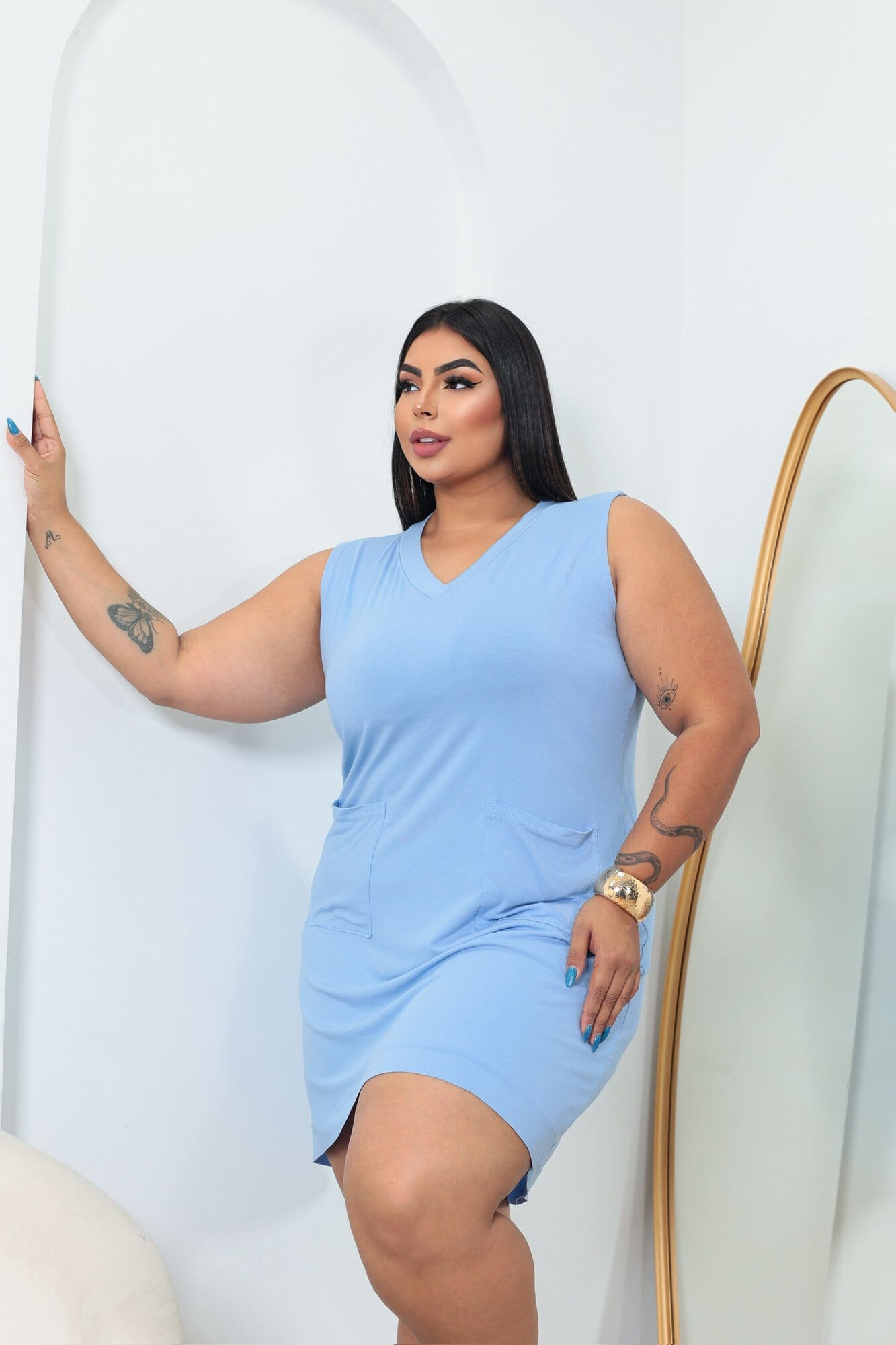 Gola V: A gola em formato V alonga o pescoço e favorece diferentes tipos de silhueta, trazendo um toque elegante.